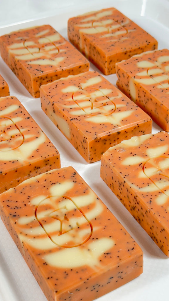 ingredients: (saponified oils of rice bran, olive, unrefined shea butter, unrefined coconut, castor), distilled water, poppy seed, sodium lactate, skin-safe & cosmetic grade micas.